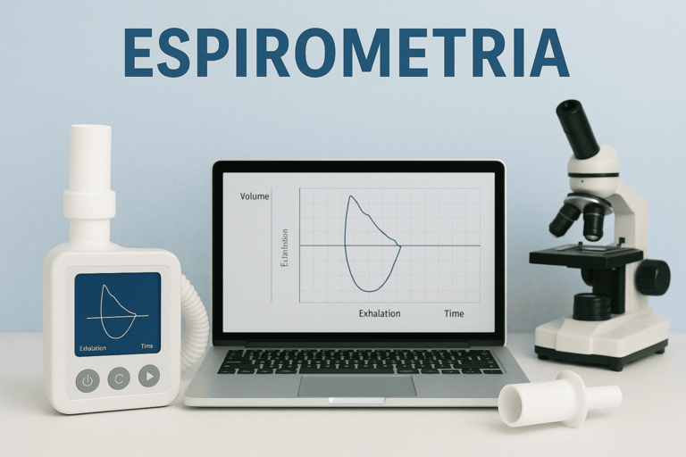 A espirometria mede a função pulmonar. É essencial para detectar doenças como asma, bronquite e DPOC, sendo comum em avaliações de saúde ocupacional, especialmente em ambientes com exposição a poeiras ou gases.